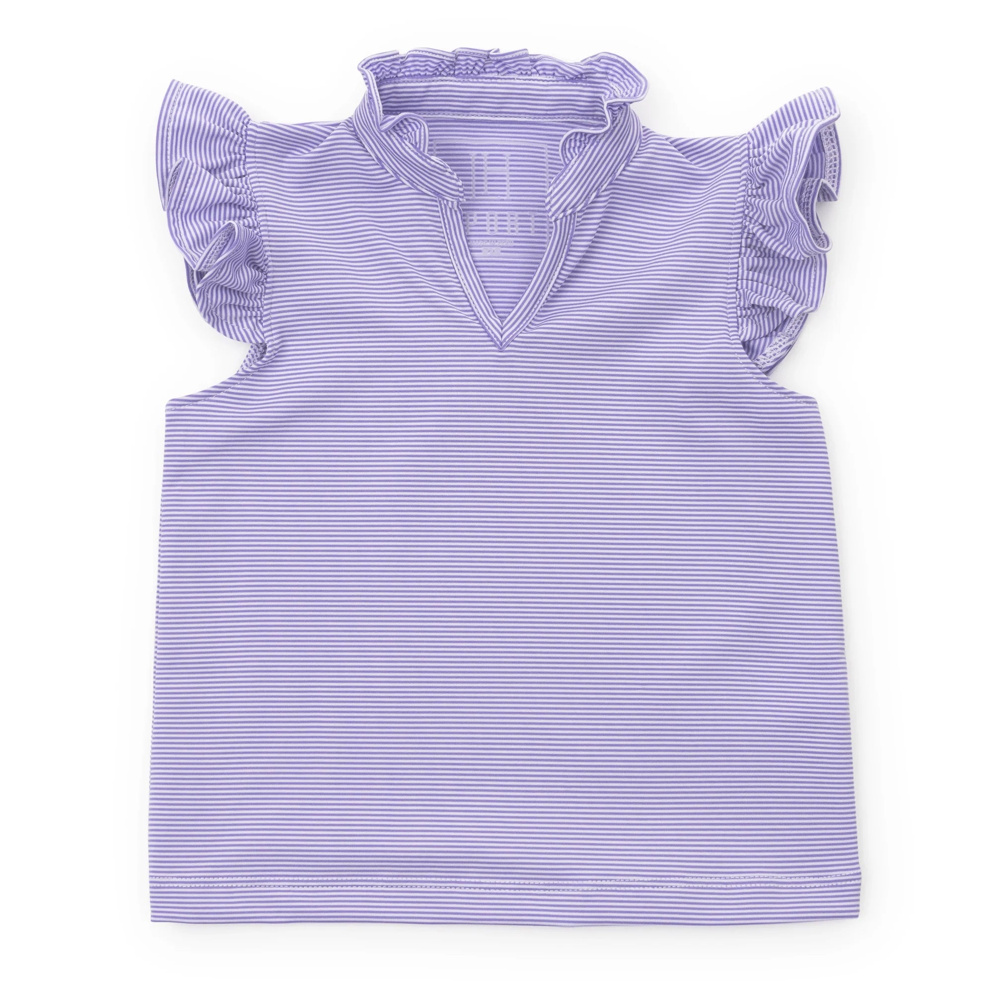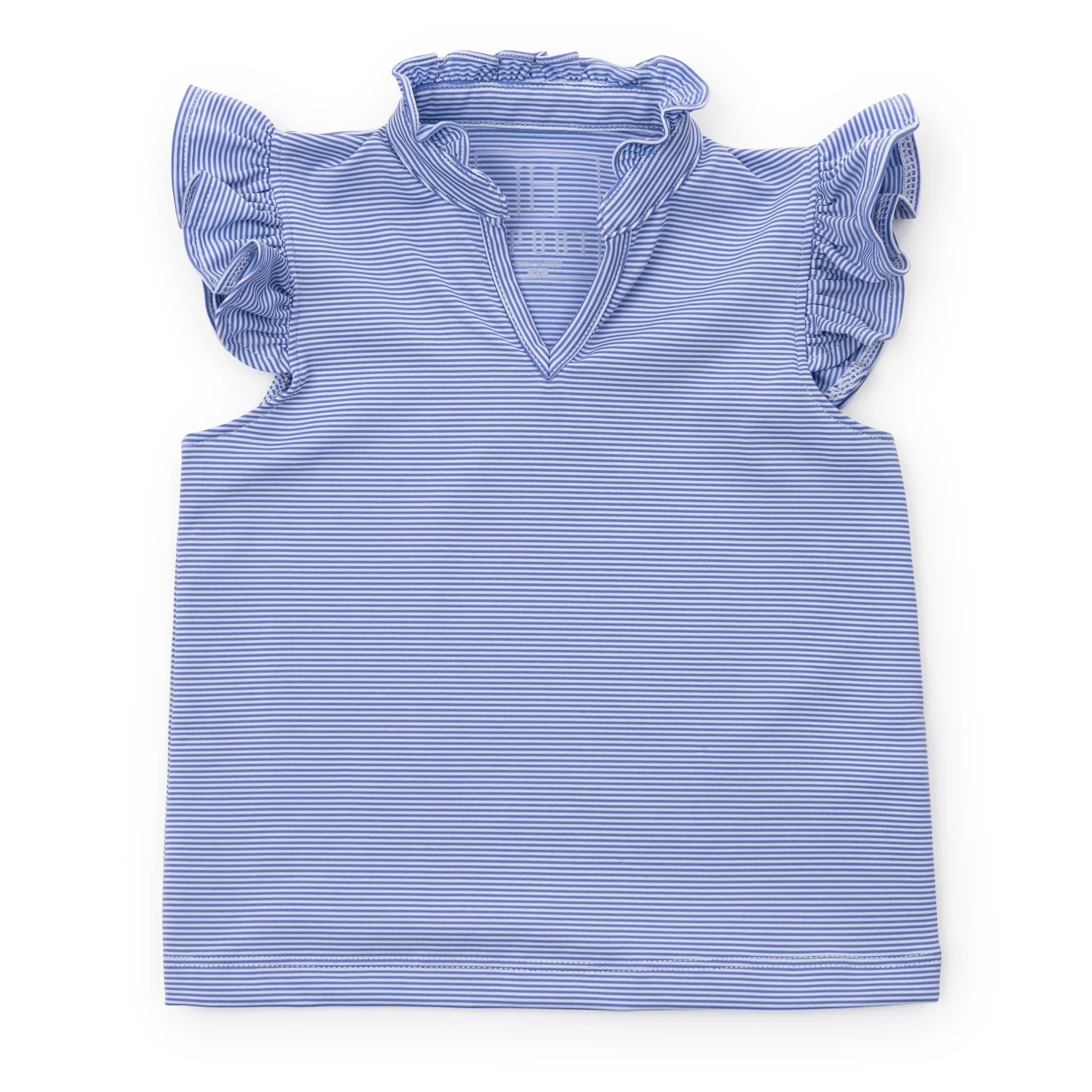 Girls' sleeveless performance top with ruffles on the sleeves and collar. Made from 92% polyester, 8% Elastane. Moisture-wicking and quick-drying.